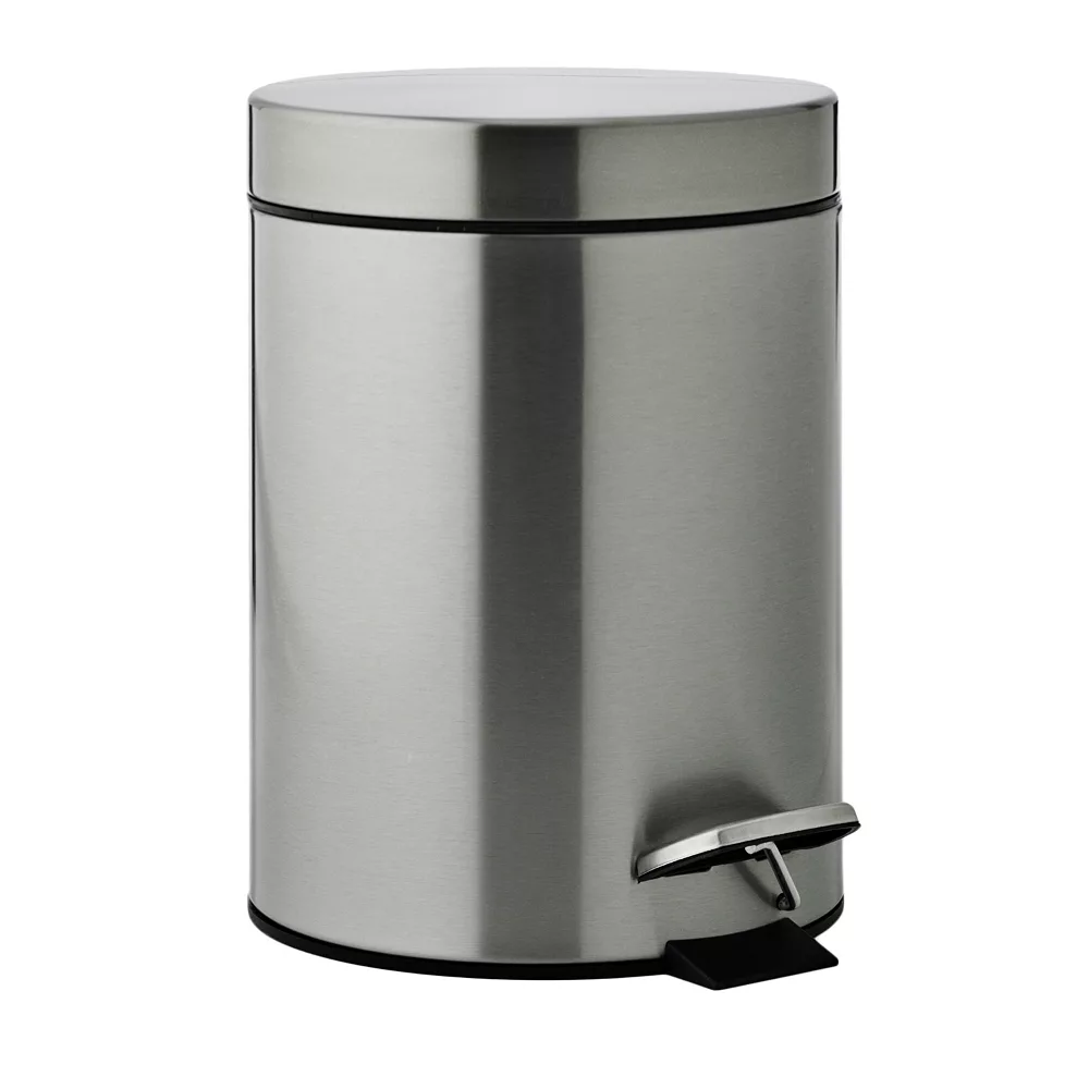 Add modern appeal to your bathroom with this step wastebasket. In nickel finish.